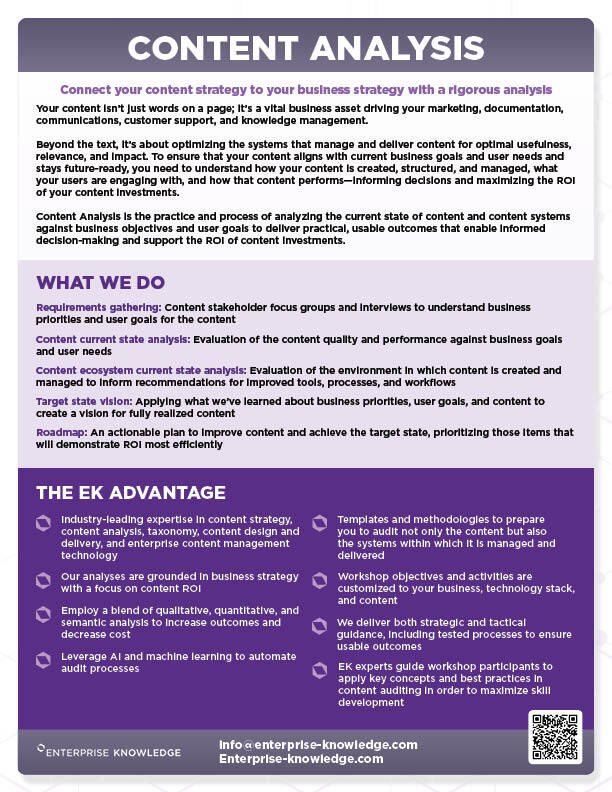 - Content transformation: Quantitative and qualitative analysis of content types, structure, and metadata to enable transformation from unstructured to structured content